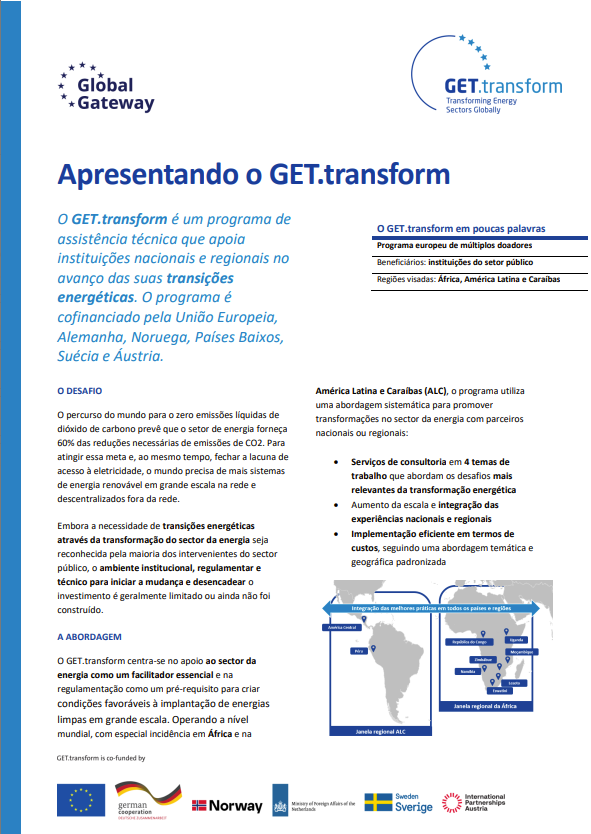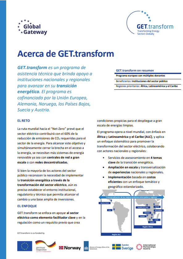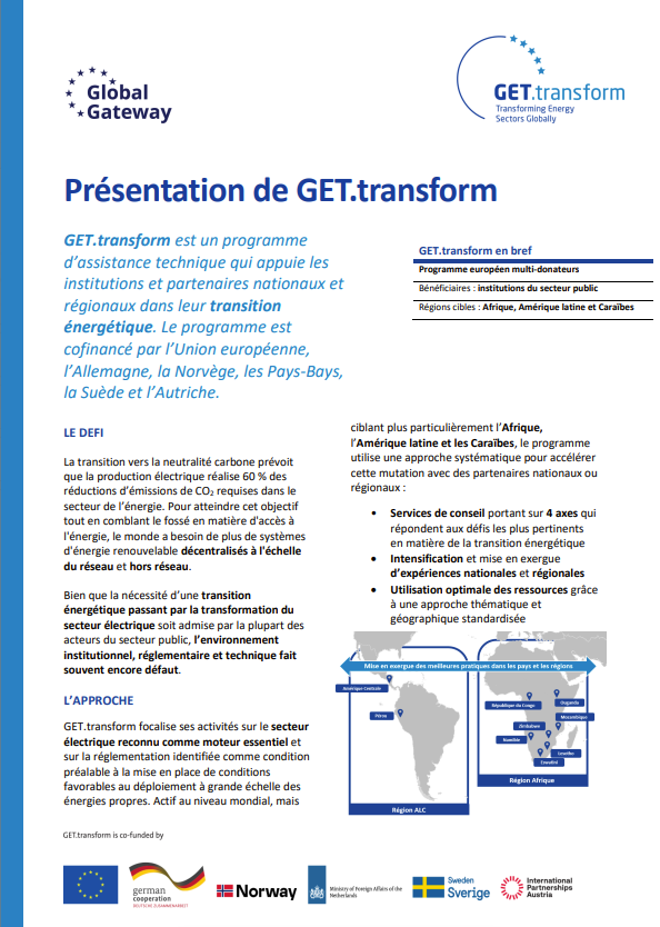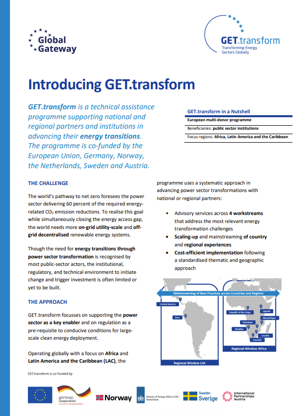 GET.transform is part of the Global Energy Transformation Programme (GET.pro), a European multi-donor platform delivering on international energy and climate goals, and draws on the experience of the former programme EUEI PDF which provided energy policy advisory for 13 years in more than 35 countries.
