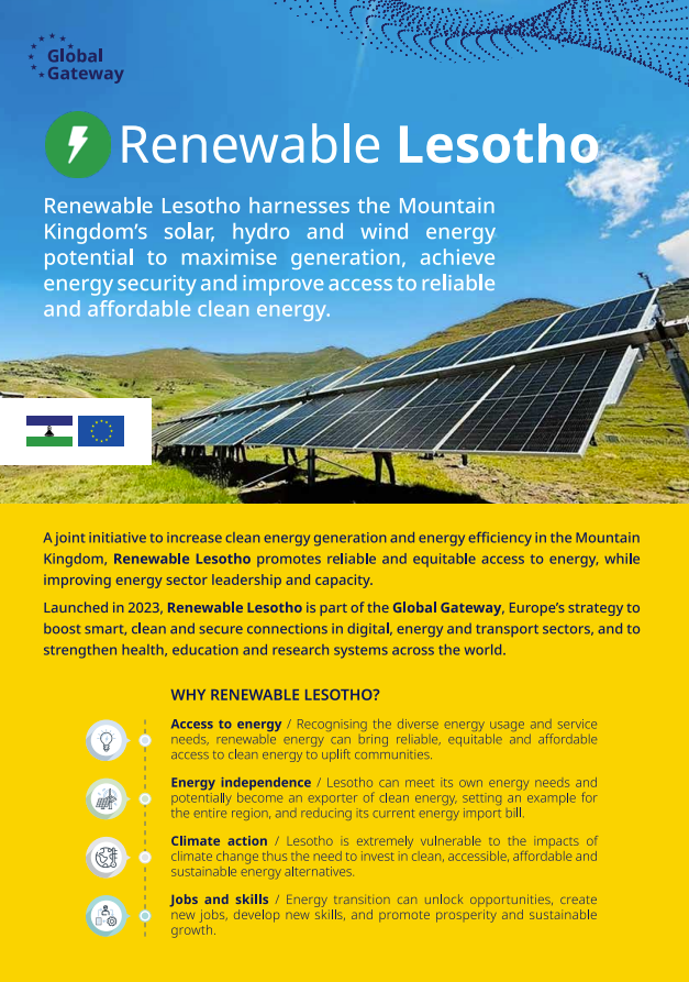 Launched in May this year, Renewable Lesotho aims to support Lesotho’s energy sector, including public entities as well as the private sector through business catalyst and matchmaking support provided by European multi-donor platforms, GET.transform and GET.invest, to stimulate renewable energy investments in Lesotho. Advancing the green and sustainable energy transition in Lesotho, GET.invest mobilises private investment in renewable energy while GET.transform supports national partners and institutions to promote energy sector transformation.